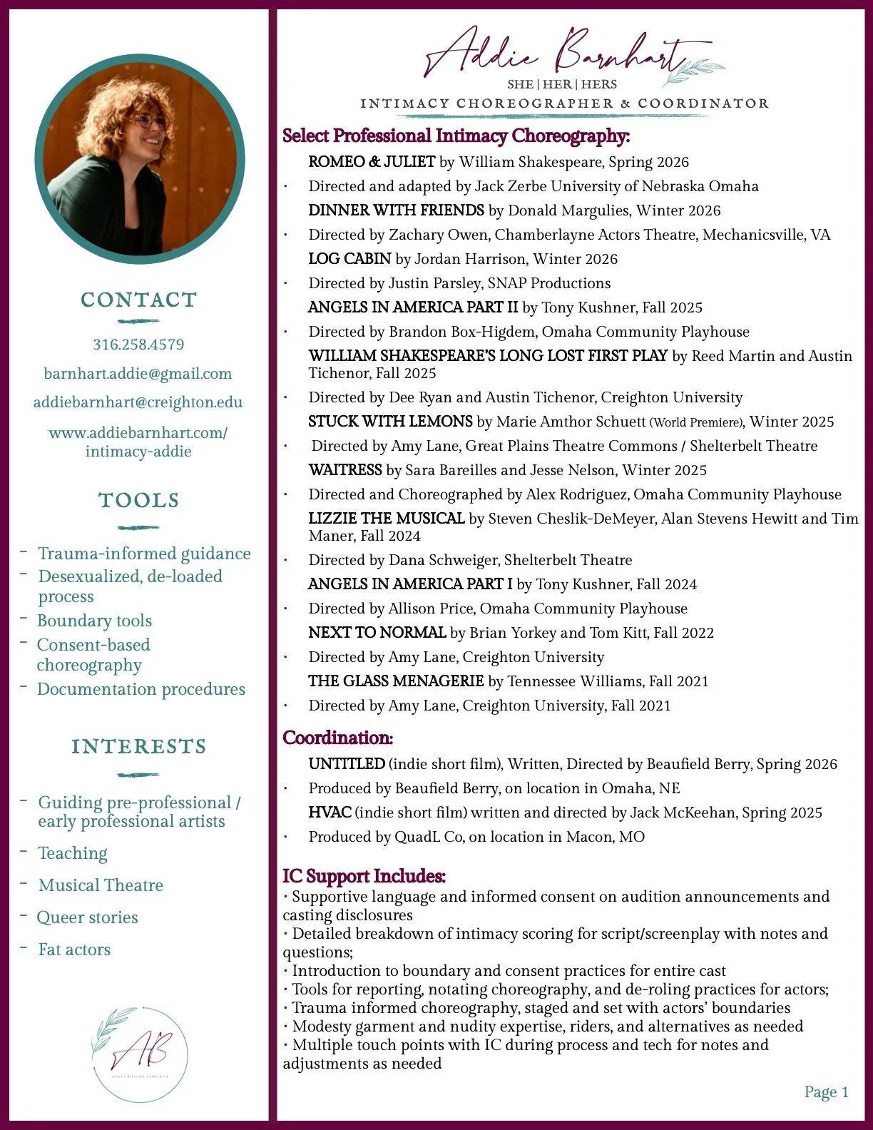 My journey started at Creighton University with my students in class and on the mainstage and has branched out into supporting local theatre companies in productions of Cabaret and Waitress directed by Alex Rodriguez, and Angels in America pt. I directed by Allison Price with Omaha Community Playhouse, Lizzie the Musical directed by Daena Schweiger and the world premiere of Stuck with Lemons directed by Dr. Amy Lane at Shelterbelt Theatre. Recently I moved into intimacy coordination on the short indie film HVAC written and directed by Jackson McKeehan, featuring Cole Doman, which moved into post-production summer of 2025.